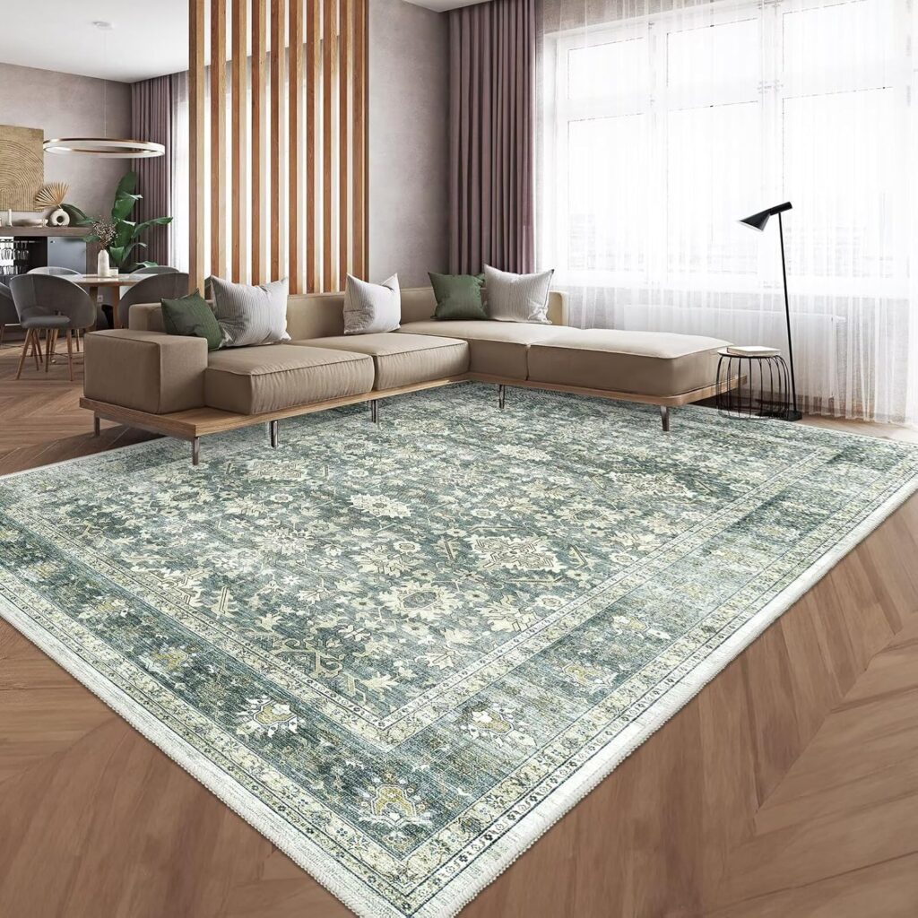 Sage Green Extra Large Area Rug 10×14 for Living Room, Distressed Floral Print Washable Rug for Dining Room Bedroom, Anti-Slip Low-Pile and Soft Accent Rug Farmhouse Office Home Decor Light Green
