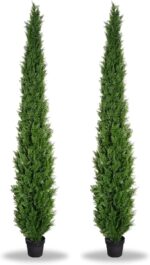 Review: Very good product. It looks like a real Italian Cypress that I have substituted due to its damage. My landscaper did not even recognize that it is an artificial tree from the distance of 3 feet. And only after touching the tree, it was clear.It stands wind, rain and so far, was very good. I bought two if these and I have one alive Italian Cypress. All three trees look the same while my real tree is still a baby. Product is realistic color, good size, leaves don’t fall, very functional( it should look good forever or for a long time.