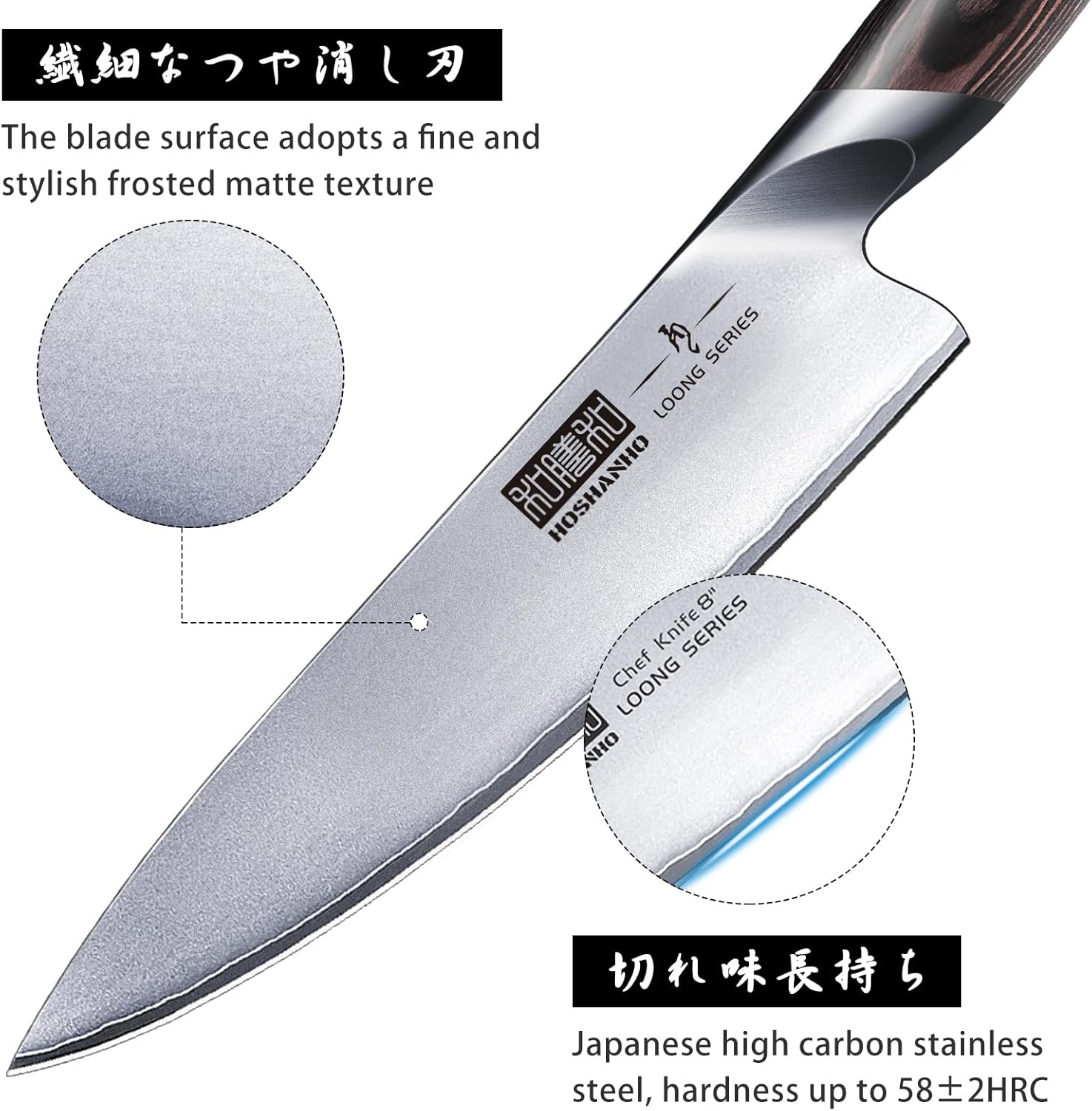【Multipurpose Knife Set】HOSHANHO 8 pieces knife set includes: 8″ chef knife, 8″ bread knife, 7″ santoku knife, 7″ fillet knife, 6″ utility knife, 3.75″ paring knife, as well as a kitchen shear, hardwood knife block; A multifunctional set of knives allows you to choose the most suitable tool