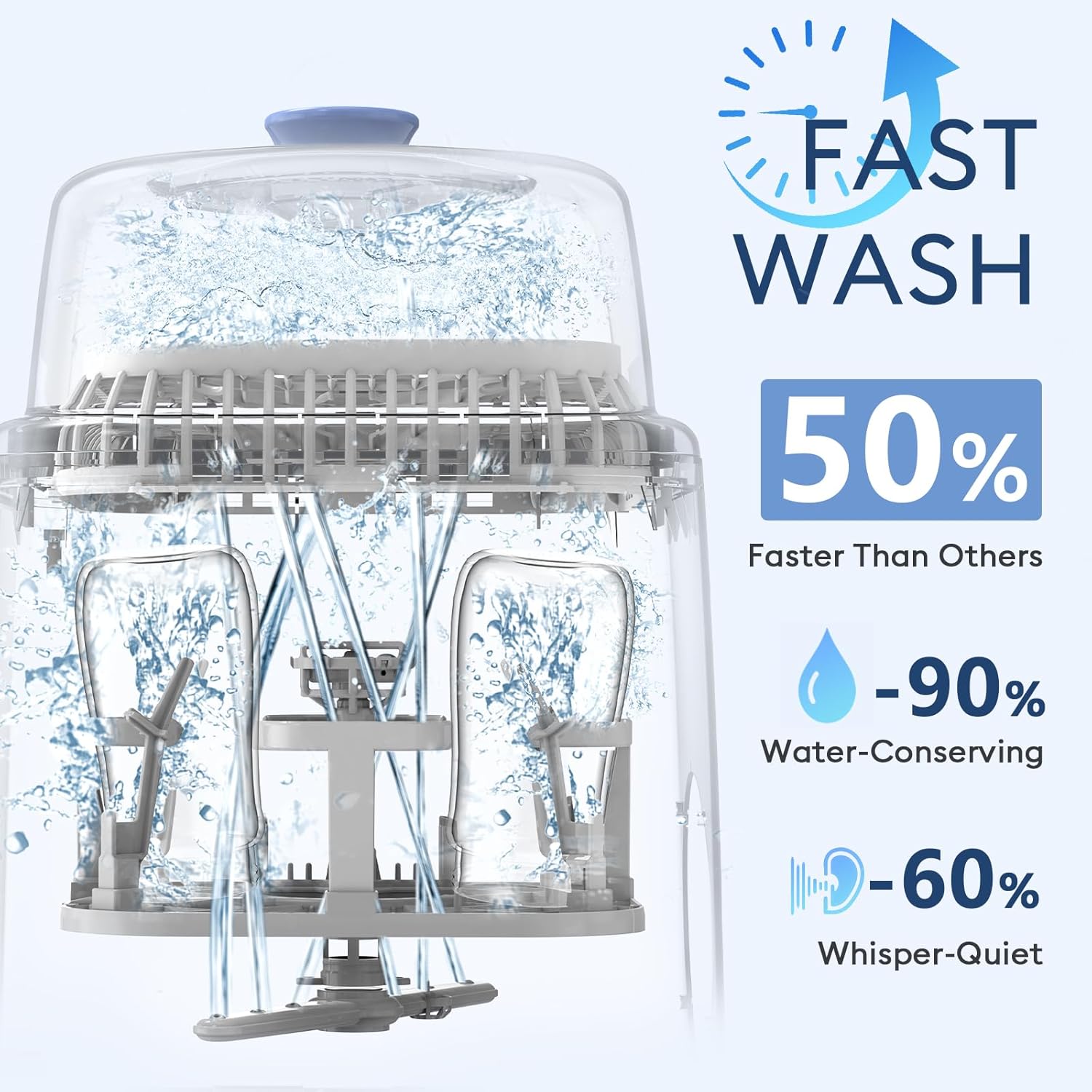 More Time with Baby: Rapid wash and drying cycle is approximately 74 mins, Normal wash and drying cycle is 84 mins. You sit it on counter and leave the drain pipe in the sink, fill it by putting water in a tank ( filtered or distilled water) and press a button. Complete all tasks in 1.4 hours. You more time to relax or play with your baby