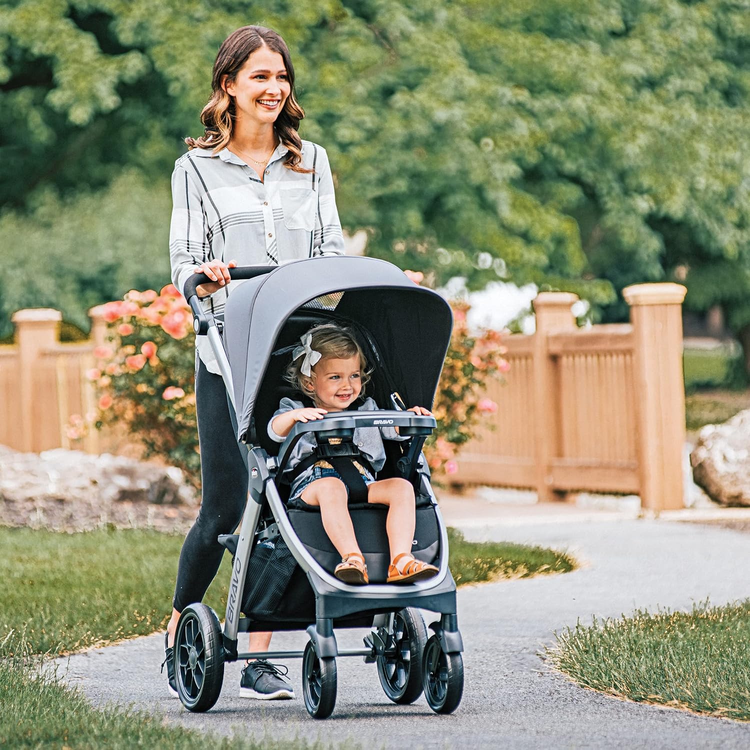 Make every outing feel like a walk in the park with the easy-to-use Bravo Quick-Fold Stroller. Three modes – a lightweight infant car seat carrier, a versatile travel system and a full-size toddler stroller – cater to your travel needs as your little one grows from newborn to toddler. A breeze to open and fold, the Bravo Stroller features a one-hand smart fold with auto-swivel wheels so it stands upright without the parent handle touching the ground.
