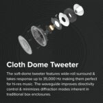 CLOTH DOME TWEETER – The soft-dome tweeter features wide-roll surround & takes response up to 35,000 Hz making them perfect for hi-res music. The waveguide improves directivity control & minimizes diffraction modes inherent in traditional box enclosures.