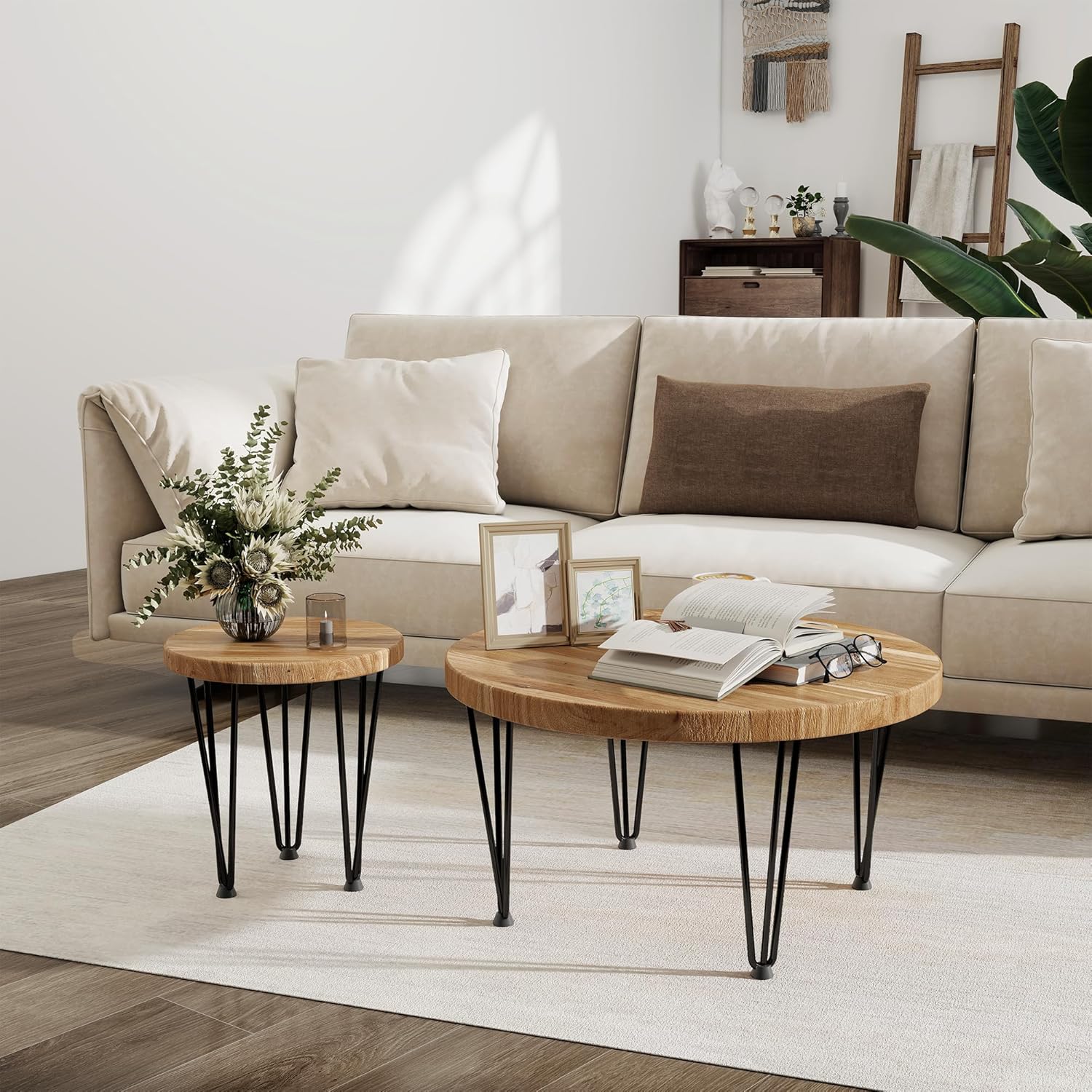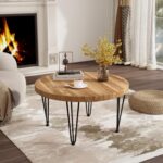 Fun Memories Round Coffee Table – Elm Wood Nesting Table with Metal Legs & Non Slip Feet Base – Rustic Nesting End Tables for Living Room Bedroom – 27.5″ D x 27.5″ W x 16″ H – Natural Color