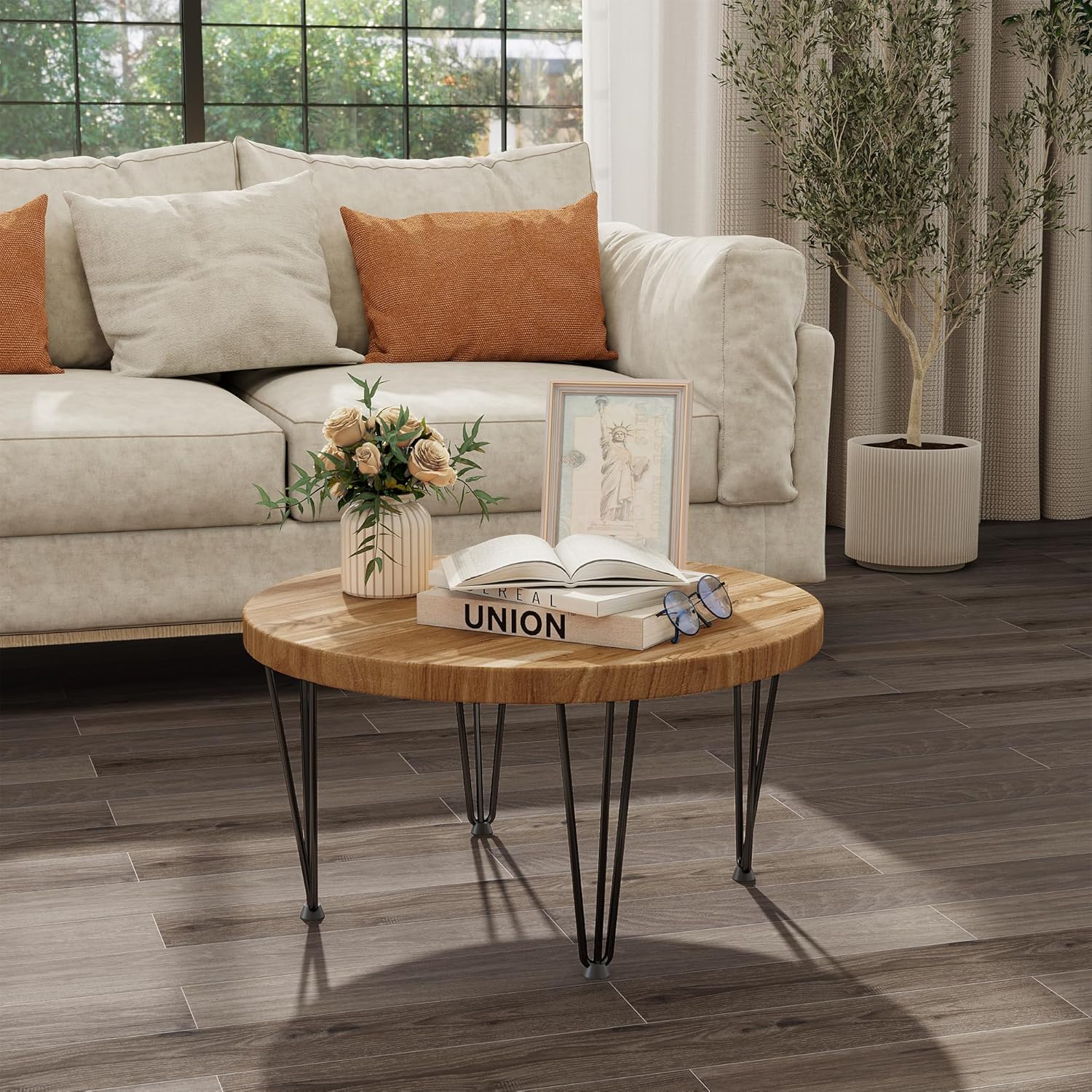 Stylish Round Design: Our solid elm wood coffee table features a classic circular shape with soft edges, blending rustic charm with modern simplicity. The natural wood grain patterns create warm visual interest, effortlessly complementing both farmhouse kitchens and contemporary living rooms for lasting style appeal.