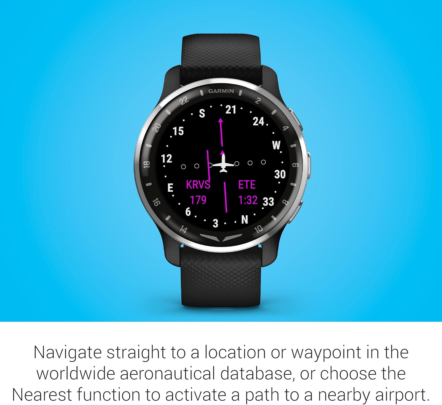 Navigate straight to a location or waypoint in the worldwide aeronautical database, or choose the Nearest function to activate a path to a nearby airport