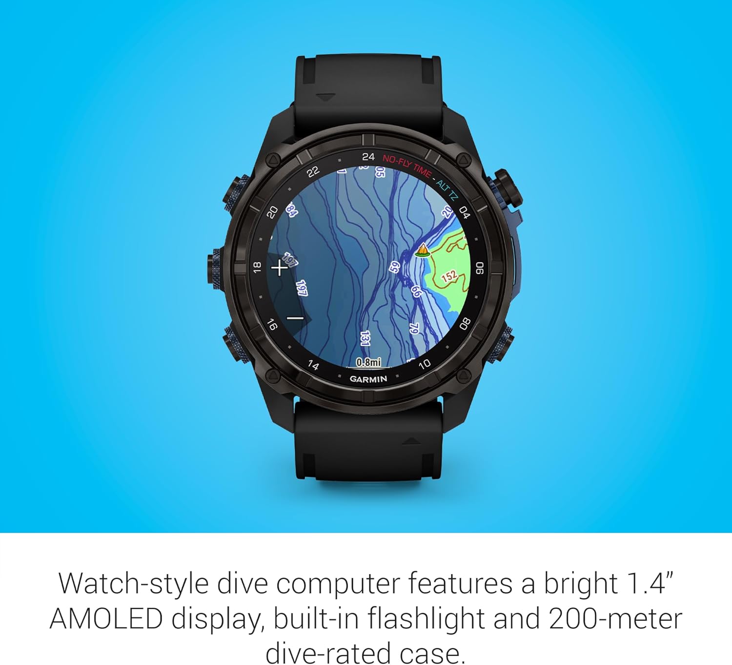 Advanced, watch-style dive computer features a stunning 1.4” AMOLED display, scratch-resistant sapphire lens, 51 mm titanium bezel and optional titanium bracelet