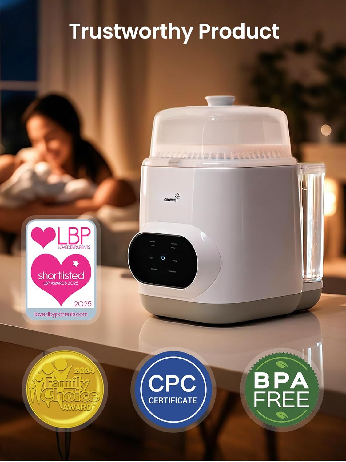 𝐒𝐚𝐟𝐞𝐭𝐲 𝐀𝐬𝐬𝐮𝐫𝐚𝐧𝐜𝐞: This baby bottle washer sterilizer and dryer is designed for use with Grownsy’s baby-safe detergent tablets. 60 detergent tablets are included in the package and the product comes with a 3-year warranty, ensuring peace of mind with every use.
