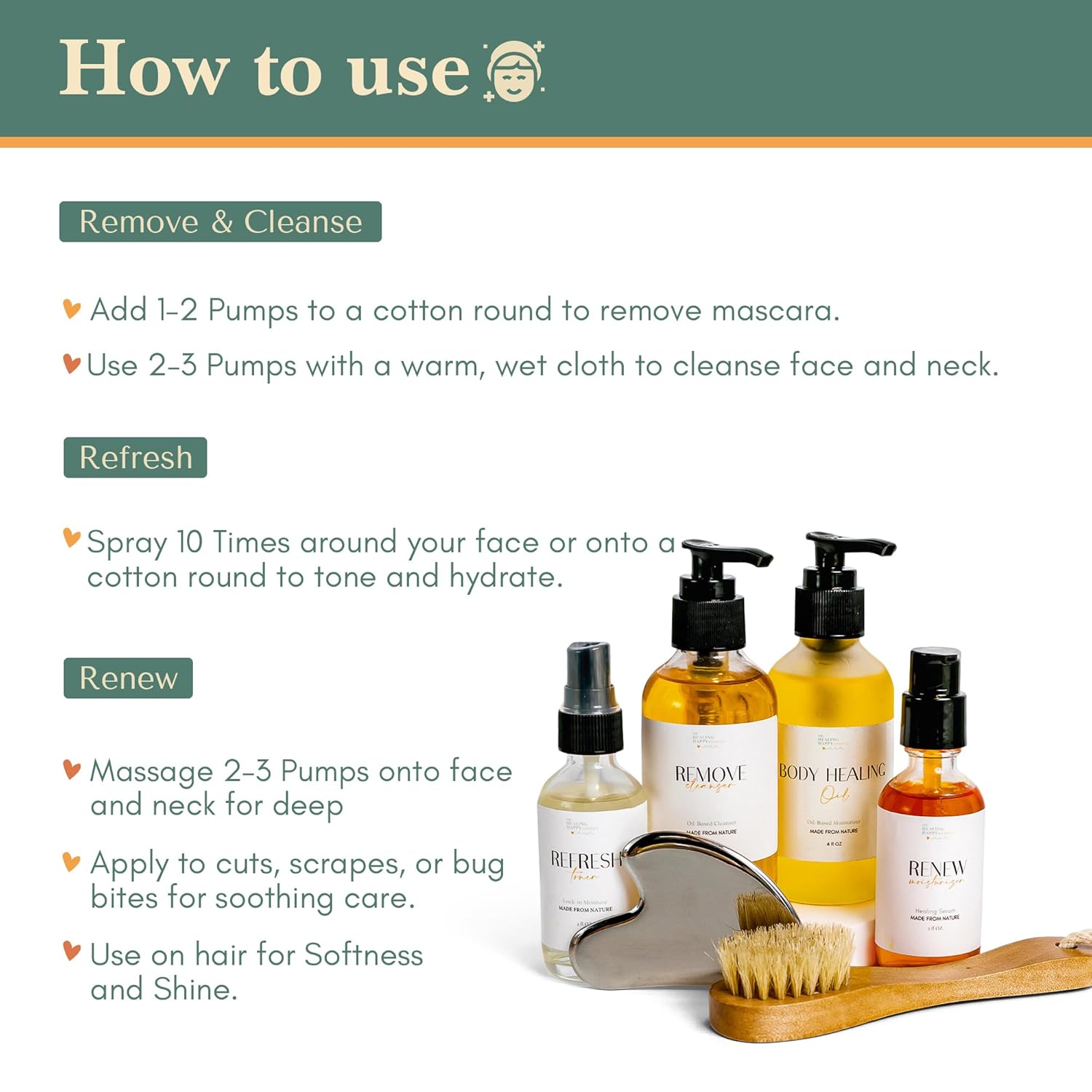 Review: I’ve been having skin issues. Breaking out at age 40 and wondering what is going on. A trusted friend recommended Healing Happy, knowing I love clean products and natural solutions. My friend was so right. I have never in my life used oil based cleansers, but heard from many people that oil based works with the natural oils in the skill and helps the skin stay moist, young and healthy. I had no idea how wonderful it would be, especially because of the pleasant surprise of essential oils too! Not only has my skin cleared up, and I am treating a couple scars with the products, but I am feeling more self love because of the routine created to use all three products and the brushing. I will stick with these clean, oil cleansers and my teenage daughter is sold too. I got her the teen kit and we both feel and look cleaner and more glow-y because of the quality of the oil and essential oils on our skin. Thank you Healing Happy! You’re well named.