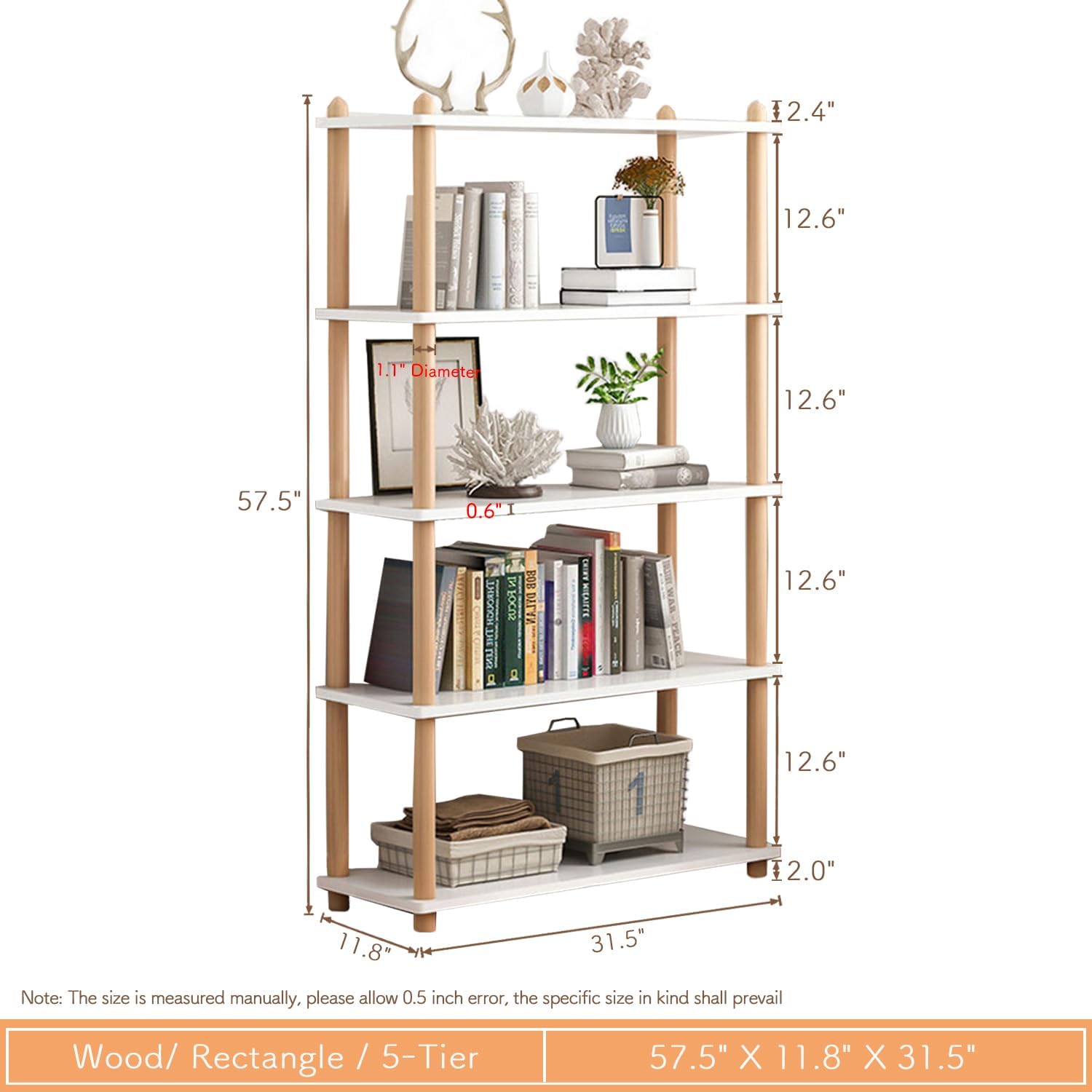 IOTXY 5-Tier Wooden Shelf Bookcase – Modern Open Bookshelf, Free Standing Storage Rack, Multifunctional Display Stand for Home and Office, White, Rectangle