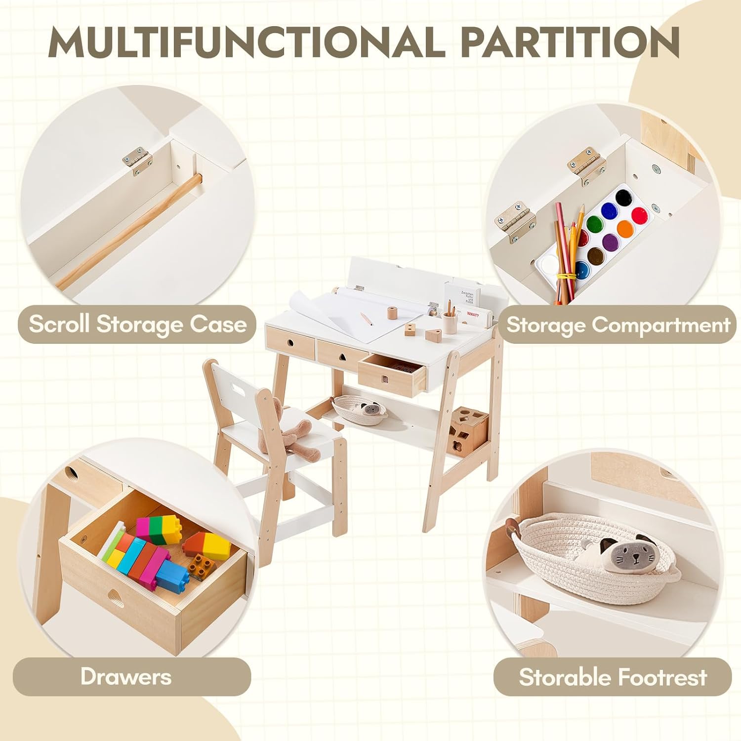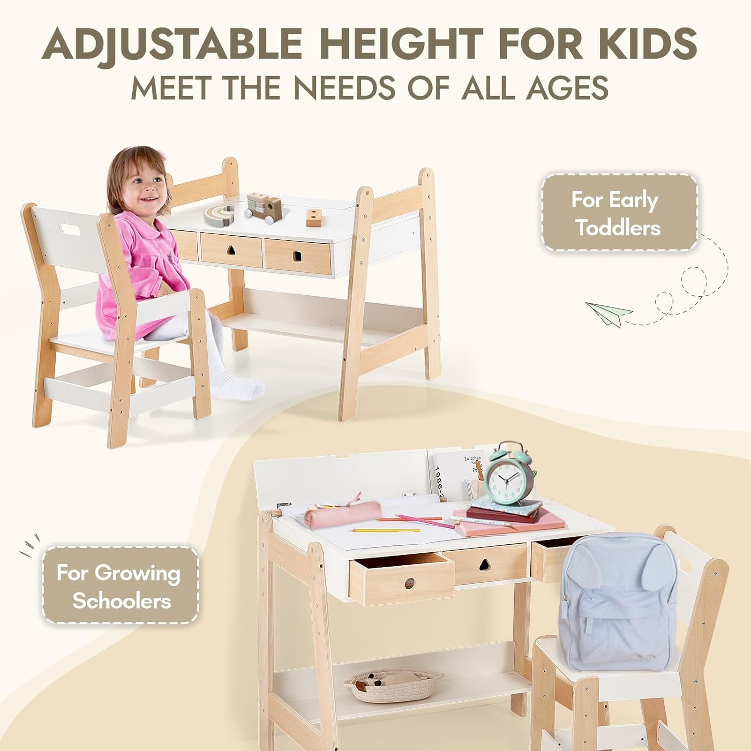 Review: It grows with them: Seriously, from a little tot to almost a teenager (ages 3-12)? That’s fantastic value. You won’t be buying a new desk every year.It’s wooden: That means it’s usually super sturdy. It can handle all the bumps, wiggles, and creative chaos kids throw at it.Storage, storage, storage! Drawers and cabinets are a parent’s dream. No more crayons or little toys rolling everywhere – everything has a home.It’s white: Classic, clean, and fits anywhere. Plus, it makes a nice bright spot for them to work or play.Versatile: Use it for homework, art projects, building blocks, or just a quiet reading spot.Think of it as their own little command center that’s built to last and helps keep their stuff organized.