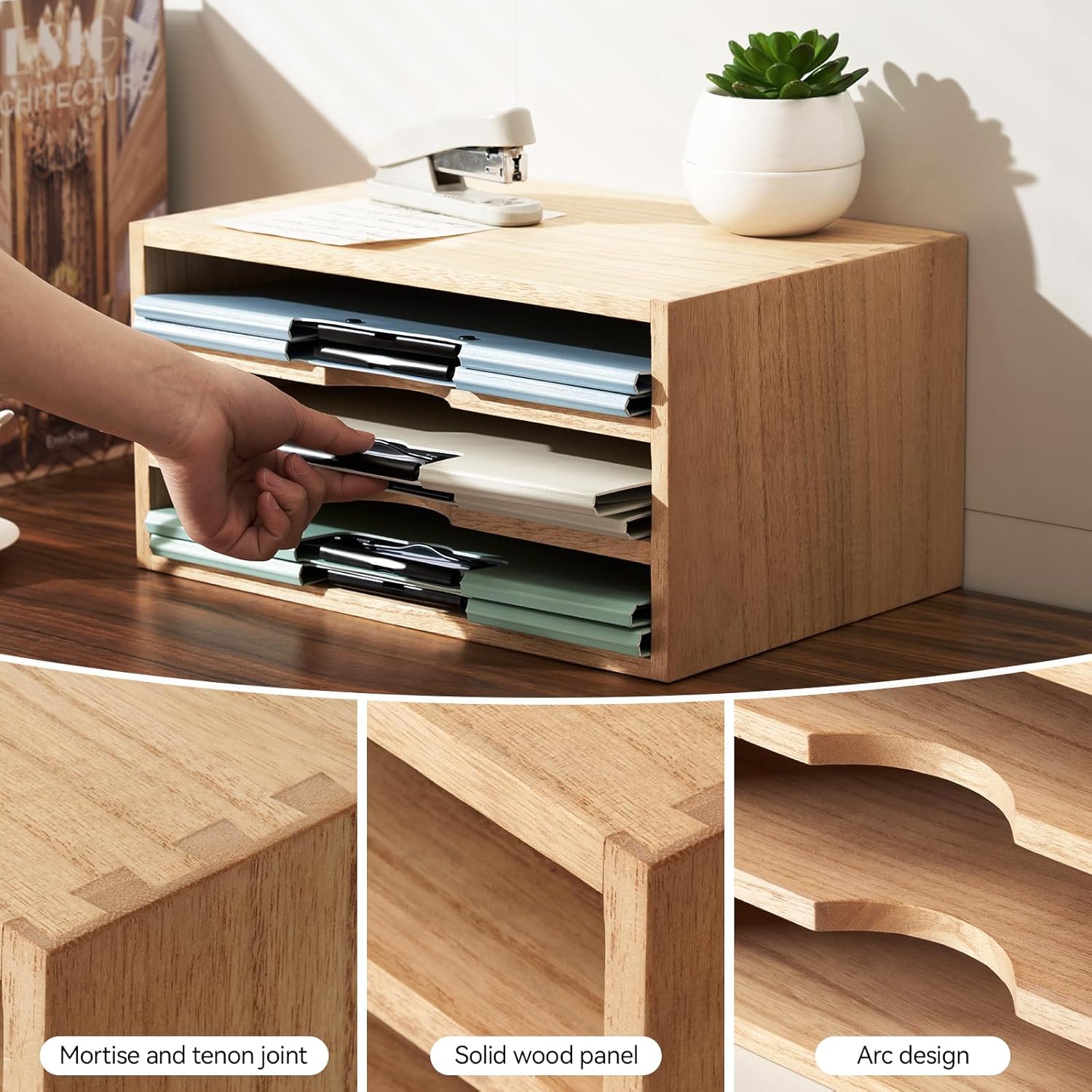 KIRIGEN Wooden Desktop Organizer Paper Storage Letter Tray File Sorter – Desk Rack Magazine File Dividers Holders for Home Office Accessories Wood Desk Cabinet with 3 Layer Trays Natural(3KWJG-NA)