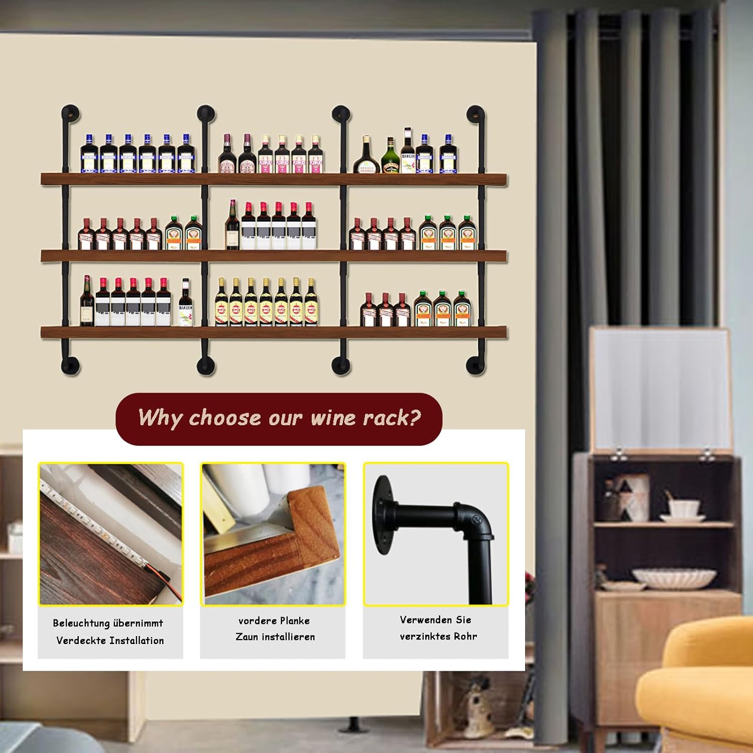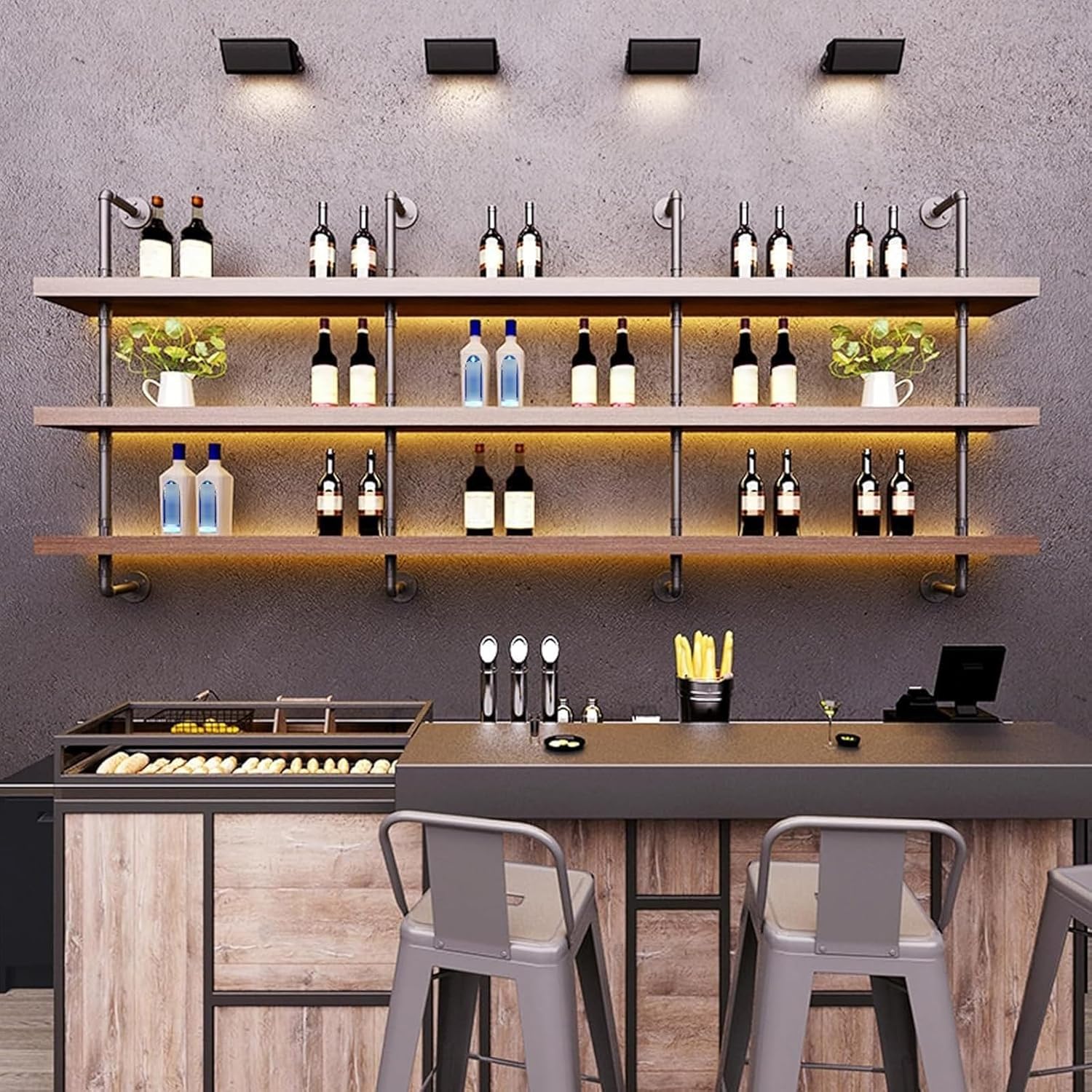 Review: Well-made and easy to install! Just be sure to mount it into the studs—I’m not confident the provided hardware would support the full weight of the bottles on its own. It looks awesome once installed. One quick note: the included LED lights run very hot. I ended up ordering a different light strip as a replacement.