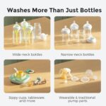 𝐖𝐄𝐀𝐑𝐀𝗕𝐋𝐄 𝐏𝐔𝐌𝐏 𝐏𝐀𝐑𝐓 𝐒𝐀𝐅𝐄: Pop in your baby bottles, as well as your wearable pump parts. Momcozy bottle washer has a dual-layer design that holds up to 4 bottles from most major brands and other baby items at a time.