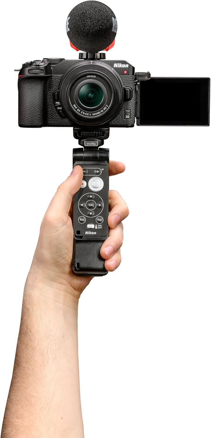 Product Description: The Z 30 Creator’s Kit pairs the compact, lightweight Z 30 creator-ready camera with the NIKKOR Z DX 16-50mm f/3.5-6.3 VR lens which offers a versatile zoom range, VR image stabilization built-into the lens and quiet operation, making it ideal for video. Also included is the Nikon ML-L7 Bluetooth Remote Control, RODE VideoMicro Microphone II and SmallRig Tripod Grip that can hold the ML-L7. 20.9MP CMOS sensor and EXPEED 6 image processing; Beautiful image quality without noise even indoors or at night, thanks to standard sensitivity range of ISO 100-51200 Worry free Autofocus. Focus automatically repositions when you hold something up to the camera in Auto Area AF mode. Eye-Detection AF. Maintains sharp focus on the eyes of people, dogs and cats even while tracking them. Selfie controls. Tap the Vari-angle screen to change focus positions and adjust brightness. Red REC lamp. Always know that you’re recording video. Over 2 hours recording time. Crisp audio. Built-in stereo mic and external mic ready. Live streaming. Stream up to 1080/60p or 4K/30p through HDMI port.