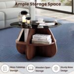Round Glass Coffee Table with Hidden Storage, Mid Century End Table with 29.5″ Tempered Glass Top & Solid Oak Wood Base, Space-Saving Modern Coffee Table for Living Room, Bedroom (Walnut)
