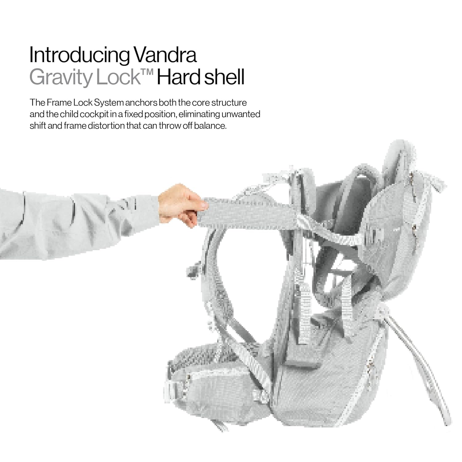 【Scandinavian Design】⛰️ Engineered for real trails , TÜV SÜD certified to U.S. safety standard ASTM F2549-22*, the Vandra carrier features our Gravity Lock hard-shell frame, which opens and locks into place to keep the child cockpit fixed—eliminating unwanted tilt or sway on uneven terrain. Designed to carry children from 16–40 lbs. The padded, fully framed cockpit surrounds your child with ventilated support and soft contact surfaces. An ergonomic back panel with lumbar support ensures balanced weight distribution for the wearer. The frame folds flat for travel and storage.