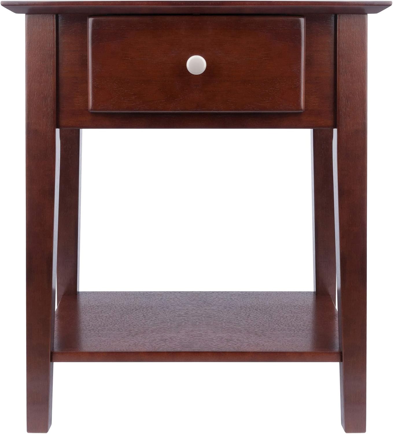 Shaker style end table/ night stand is made of solid and composite wood, finished in Antique Walnut stain. The beveled top gives an upscale look to the table which is complete with storage drawer and bottom storage shelf.